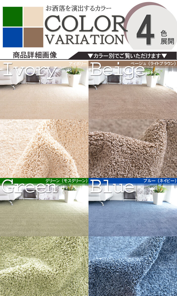 ■サイズ江戸間10畳(352x440cm) ■素材ポリエステル100% ■機能アース虫カビnot・アース防ダニ・抗菌・防臭・防音(遮音)・ホットカーペット対応・床暖房OK ■パイル長約10mm ■全厚約14mm ■カラーグリーン・ブルー・アイボリー・ベージュ ■カラー紹介 グリーン(モスグリーン):深みのあるモスグリーンのような色合いです。