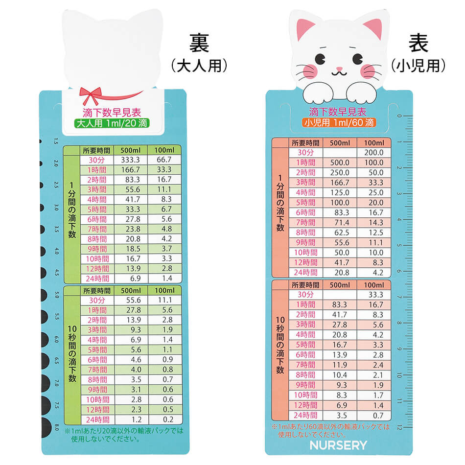 かわいい白ネコは、滴下数早見表の大人用と小児用が裏表になっています。