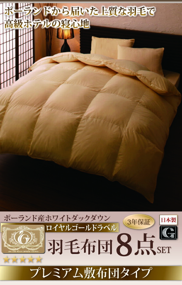 国内洗浄羽毛 スペイン産ダック93% ロイヤルゴールドラベル 羽毛布団8点セット プレミアム敷布団 極厚ボリュームタイプ セミダブル8点セット