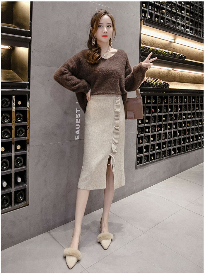 ニットスカート 秋冬 レディース タイトスカート 膝丈 無地 フリル マキシ丈 タイト ニット スリット入り ハイウエスト ファション フォーマル 通勤 OL
